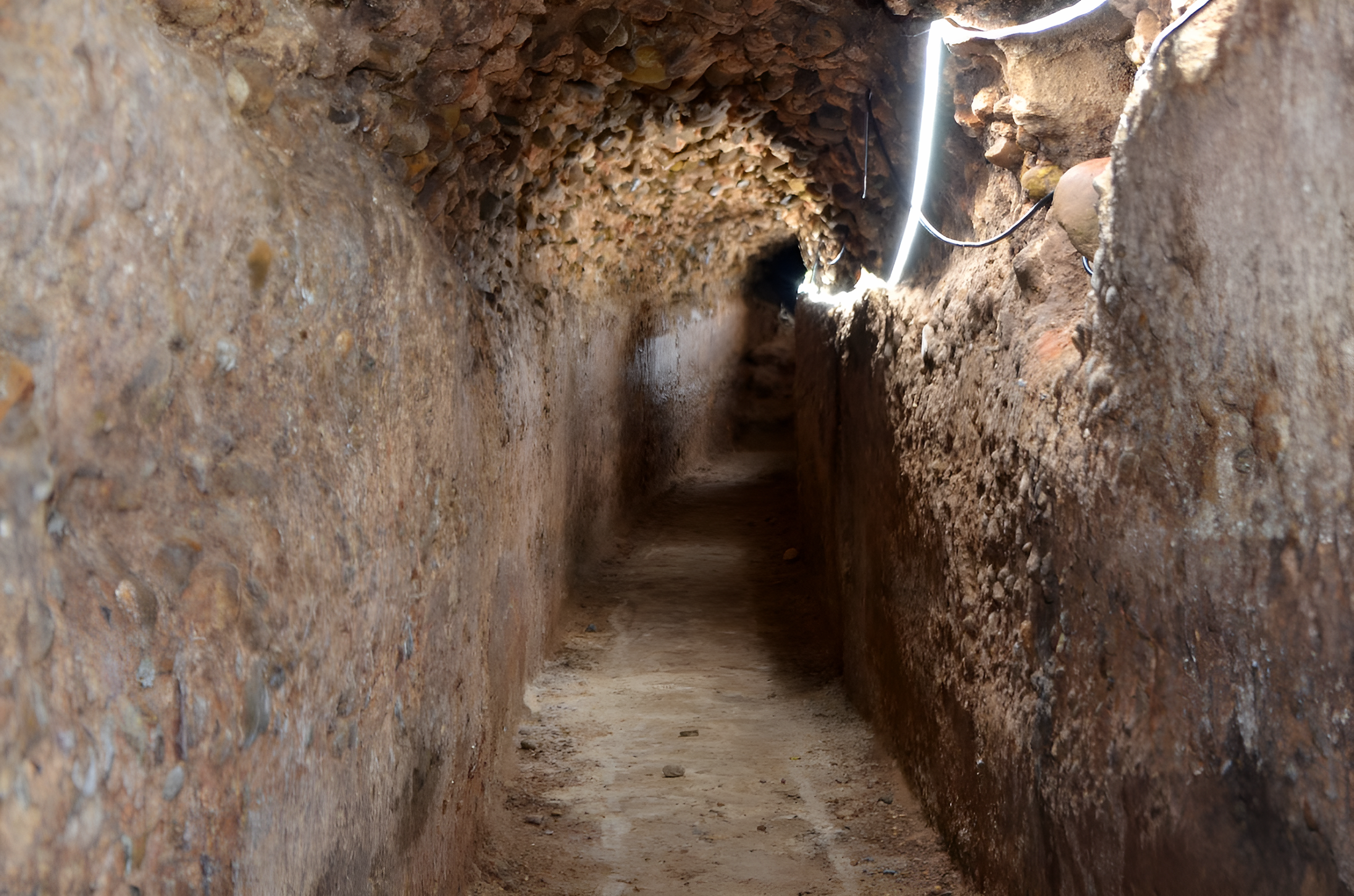 La construcción presenta paredes de 43 cm de grosor, con un espacioso ancho de 64 cm y una altura de 1,32 metros, finalizando en una bóveda de cañón. A lo largo de uno de sus muros se pueden observar huecos que probablemente fueron creados para la iluminación mediante lucernas, facilitando así las labores de mantenimiento y limpieza del sistema de alcantarillado.